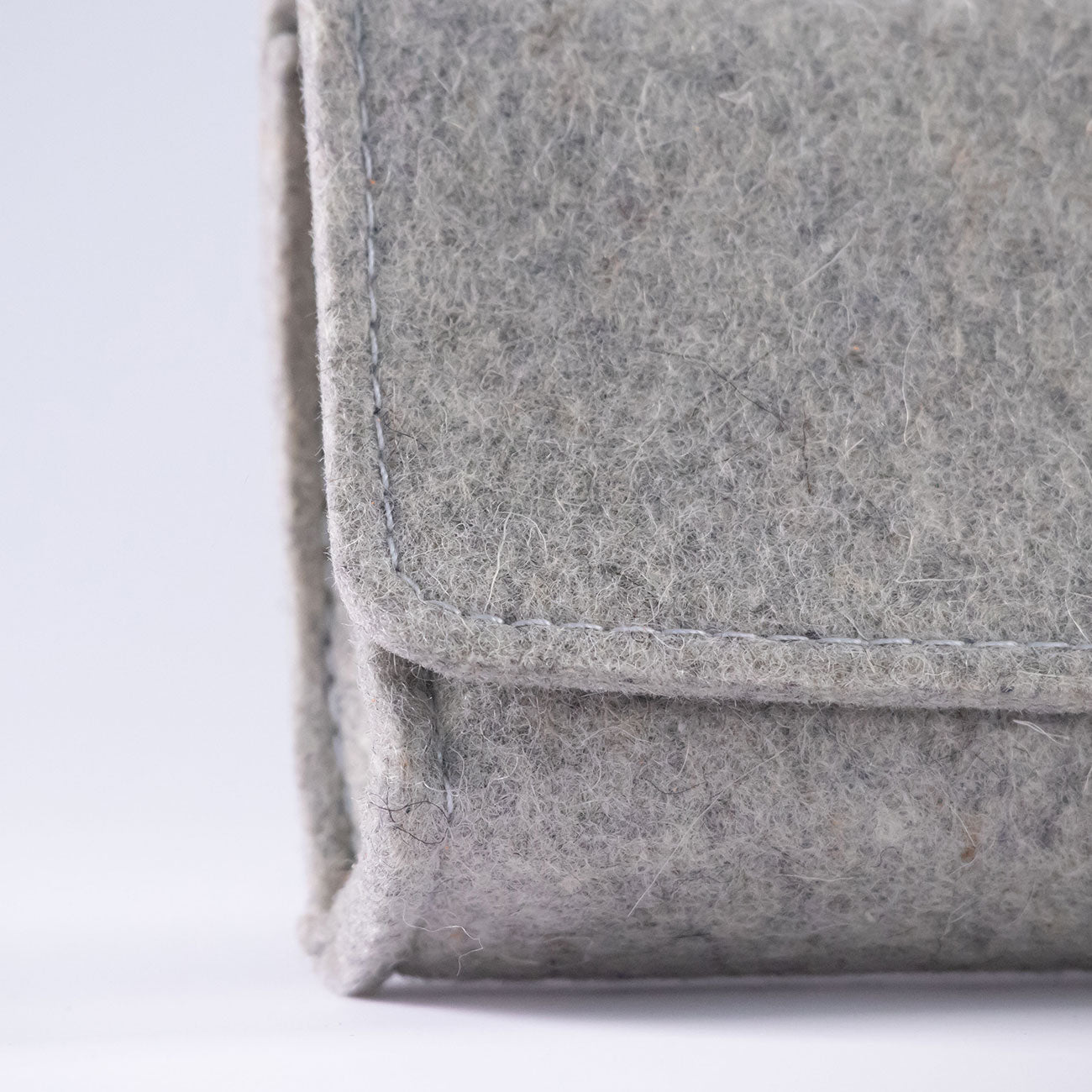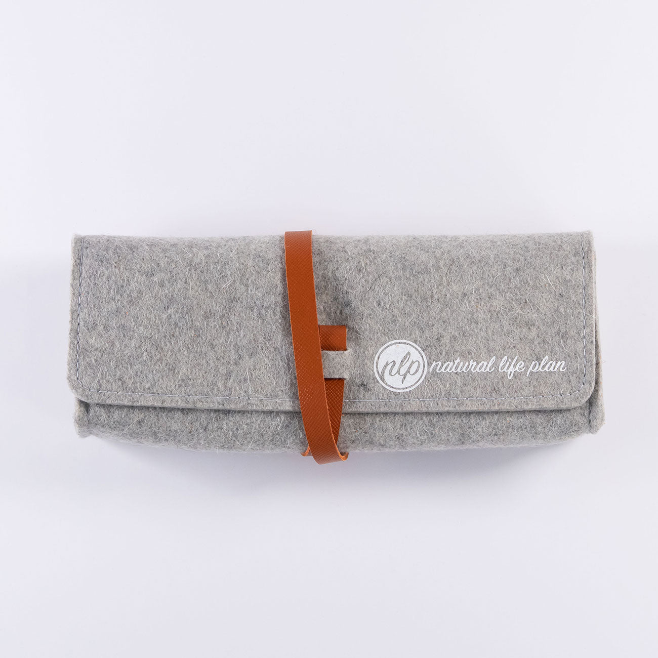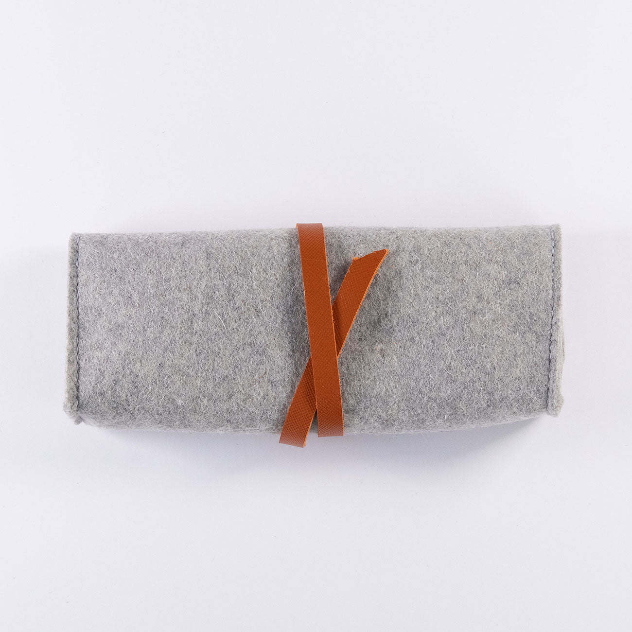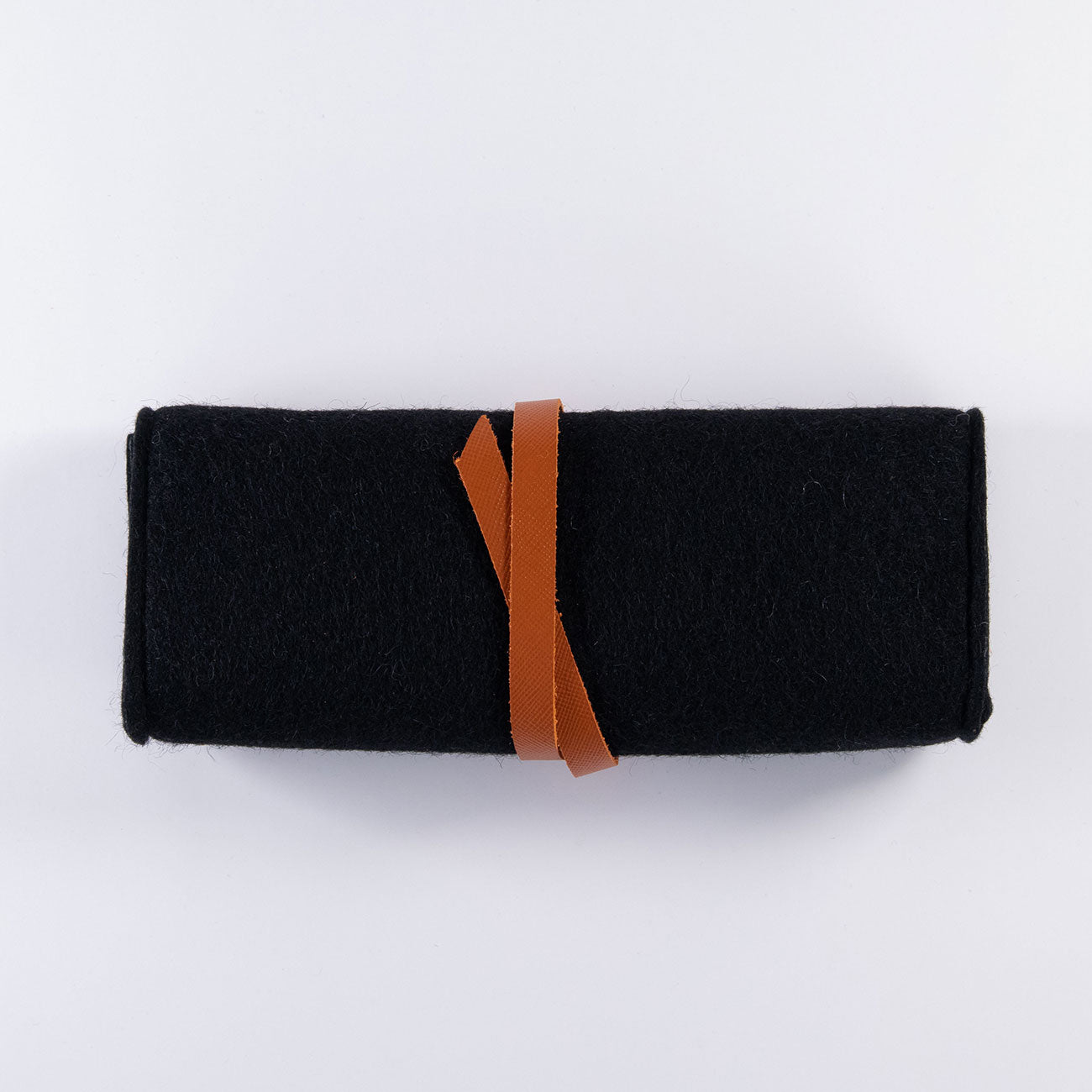 本体には羊毛100%、止め紐には天然皮革(牛革)を使用しており、環境に配慮した優しいメガネケースです。