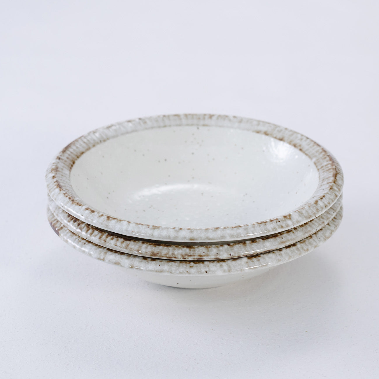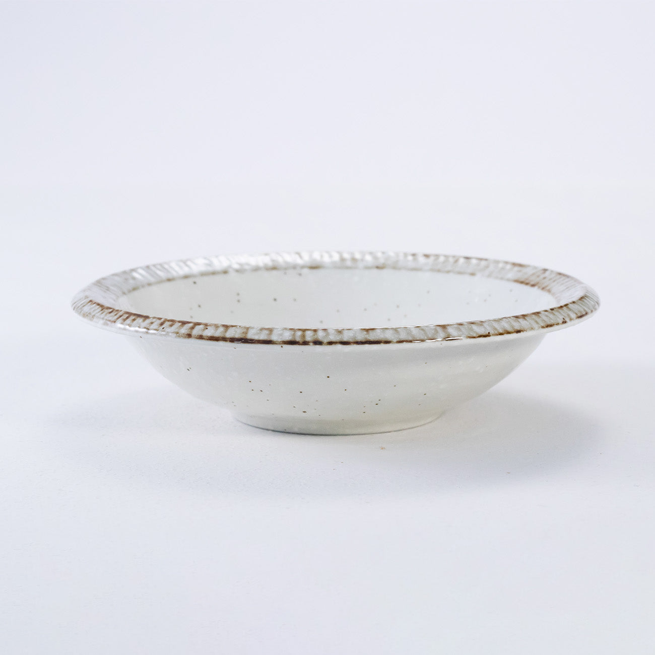 使いやすいニュアンスカラーのお皿で、淡雪のような白いベースカラーにぽつぽつとした模様が映え、高級感も感じられるデザインです。