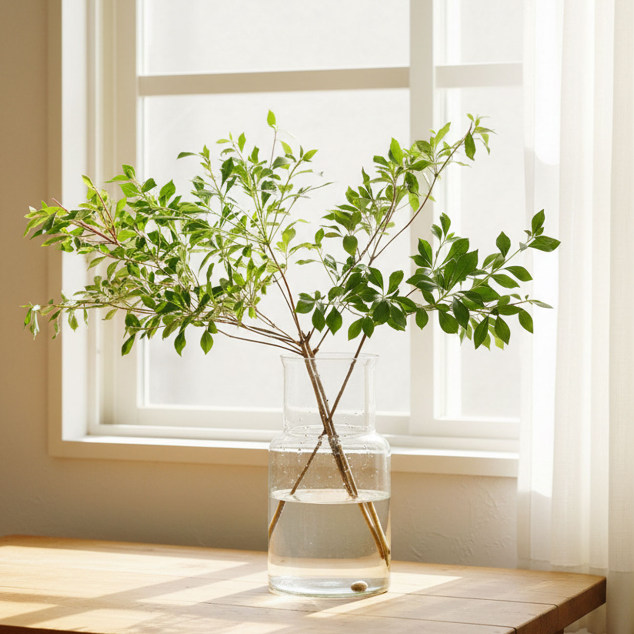 シンプルなガラス製なので、花そのものを主役にでき、部屋のテイストを選ばず使えます。